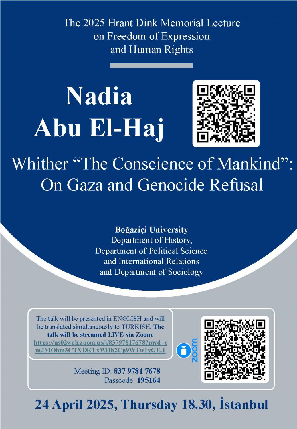 Boğaziçi University Departments of History, Political Science and International Relations, and Sociology cordially invite you to the 2025 Hrant Dink Memorial Lecture. The talk, entitled "Whither 'the Conscience of Mankind': On Gaza and Genocide Refusal" will be delivered by Nadia Abu El-Haj on Thursday, April 24, 2025 at 18:30 (Istanbul time).
