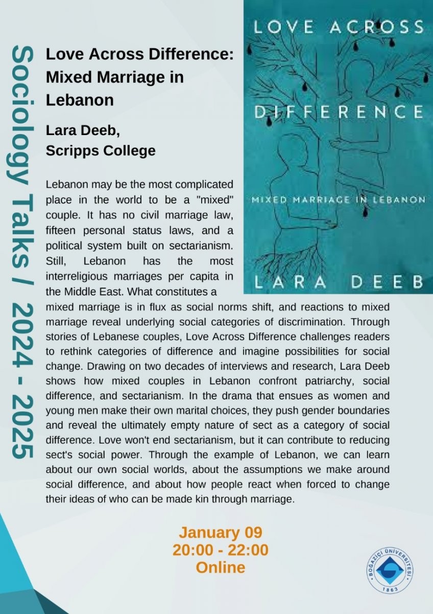 The Sociology Department at Boğaziçi University cordially invites you to the Sociology Talks 2024-2025 seminar series. Lara Deeb's talk titled "Love Across Difference: Mixed Marriage in Lebanon" will be held online on January 9th, between 20:00 – 22:00.
