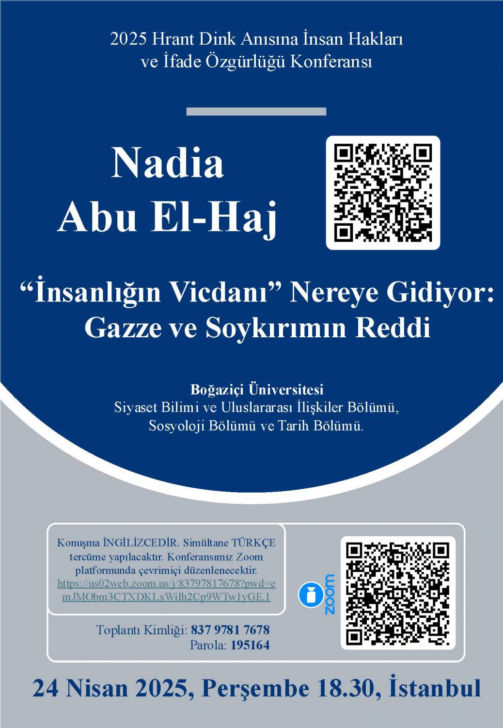 Boğaziçi Üniversitesi Siyaset Bilimi ve Uluslararası İlişkiler, Sosyoloji ve Tarih Bölümlerinin düzenlediği 2025 Hrant Dink Anma Konferansı 24 Nisan 2025 Perşembe saat 18:30'da Zoom üzerinden gerçekleşecektir. Nadia Abu El-Haj'ın "'İnsanlığın Vicdanı' Nereye